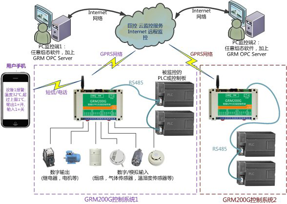 GRM200G PLC無線通訊模塊使用GPRS(控制器需插入手機SIM卡)作為通訊手段,一個模塊即可實現(xiàn)PLC的電腦遠程監(jiān)控,短信報警,遠程維護,遠程催款等。